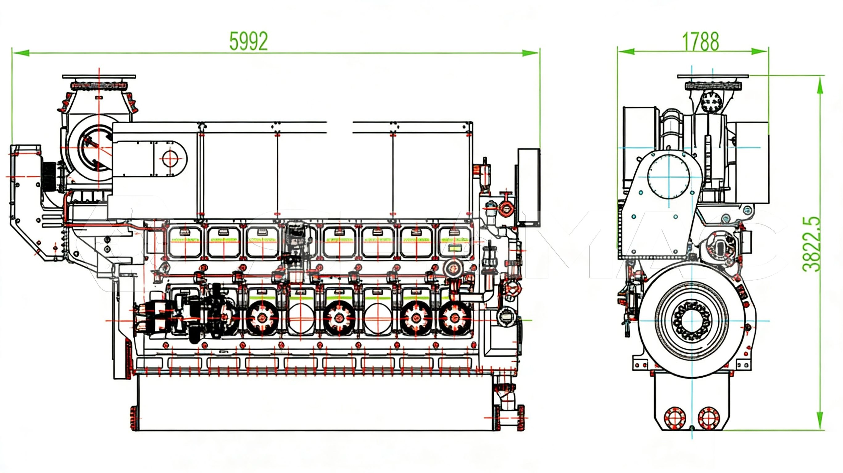 | Lube Oil Consumption | ≤0.8 g/kW·h | Dimensions(L×W×H) | 5992×2240×3822.5 mm (Only reference, please refer to the drawing) | ||